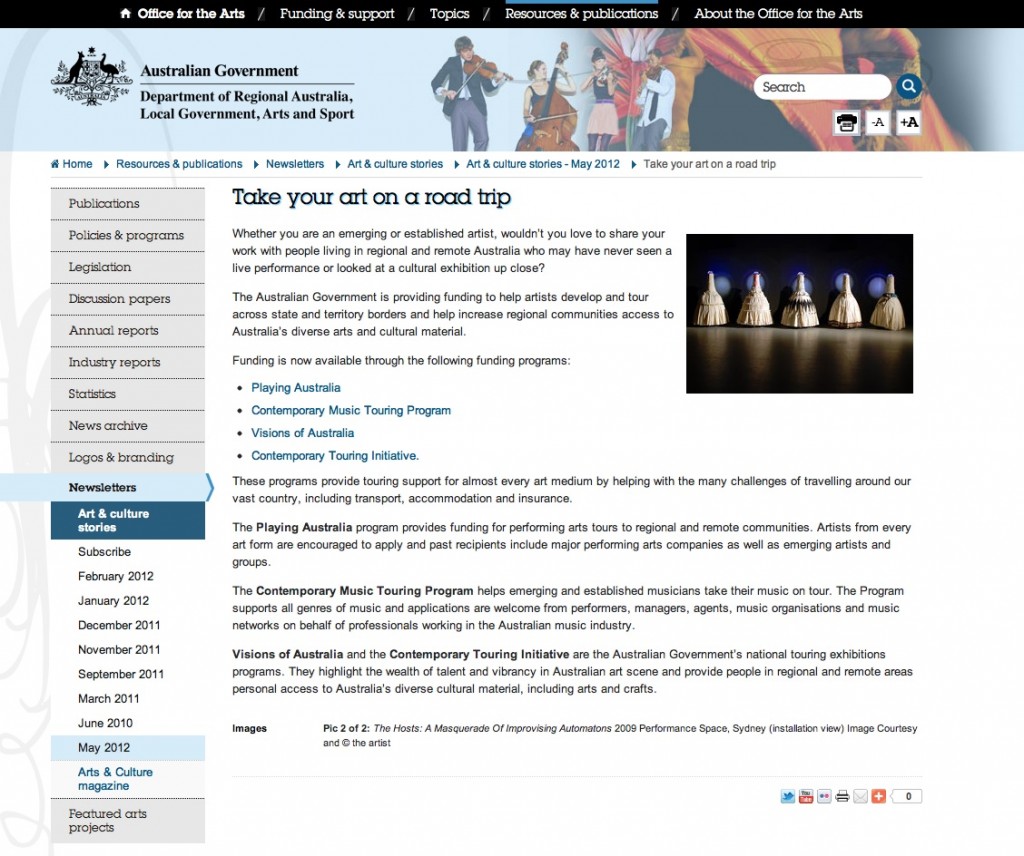 This assumption that regional/remote communities “have never seen live performance or exhibition up-close” is utterly offensive. culture does not only reside in cities. *fume* http://www.arts.gov.au/resources/newsletters/art-and-culture/2012/05/road-trip