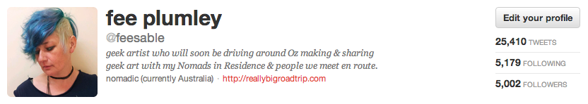 The 5000th follower was @prawn_gravies, who was at the This is Not Art Digital Forum last weekend (the #tinadigital that I filled my twitterfeed with). I don’t think he’d had any idea about the 5000th thingie, he was just following me back after the event. He’s actually moving to Singapore soon so this will be an interesting remote-cuppa!