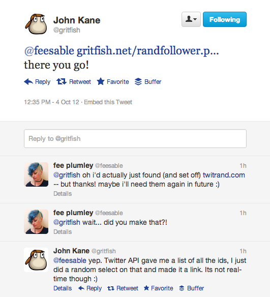 I couldn’t bear the idea of printing and cutting up 5000 twitter names just so I could pull one out of a hat! So I tweeted that I was looking for a random follower app, and then stopped being lazy and went and googled for one. I found twitrand which allegedly scours your followers for a random person but hasn’t come back with anything yet. And by the next time I’d looked at twitter, @gritfish had made me one!